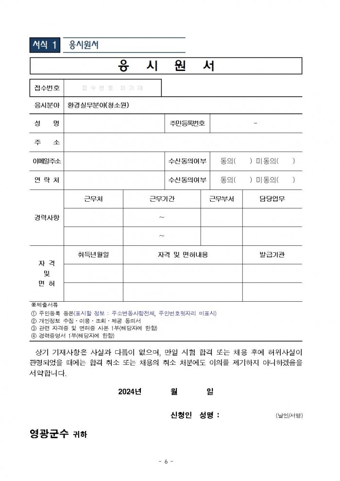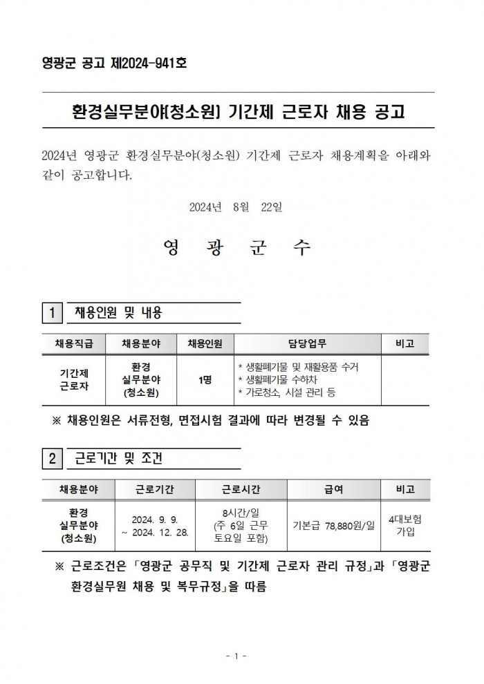 1. 채용분야: 환경실무분야(청소원) 기간제 근로자