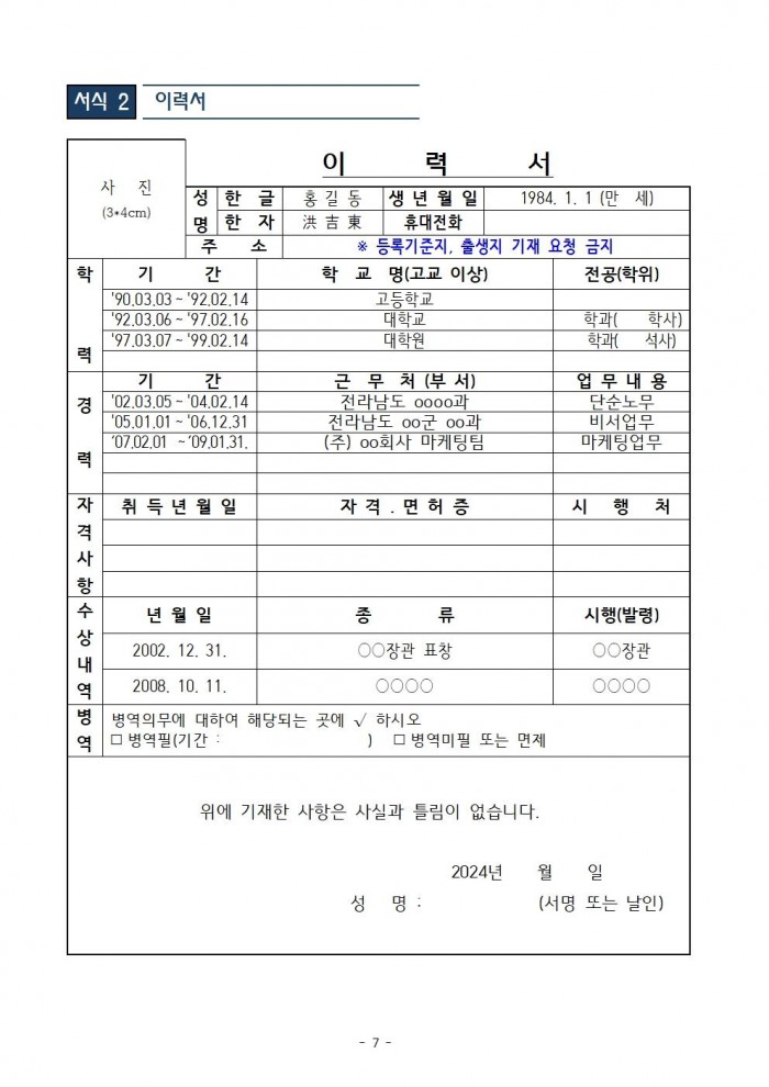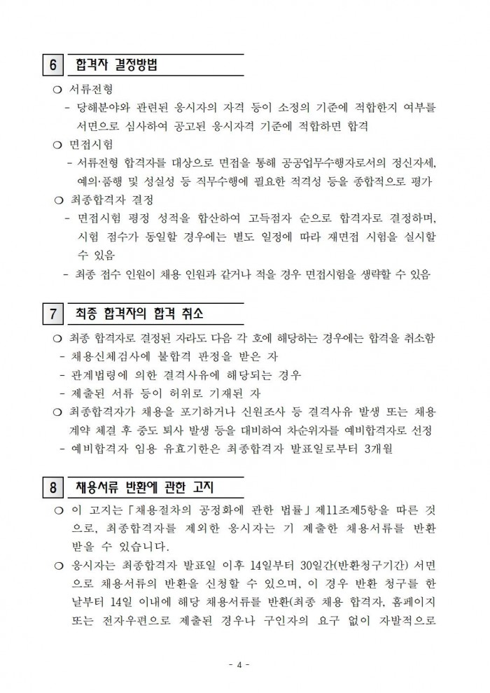 7. 채용방법: 공개경쟁채용(1차 서류심사/ 2차 면접심사)