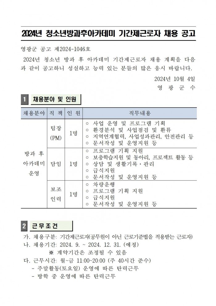 2. 모집내용: 청소년방과후아카데미 기간제근로자 채용