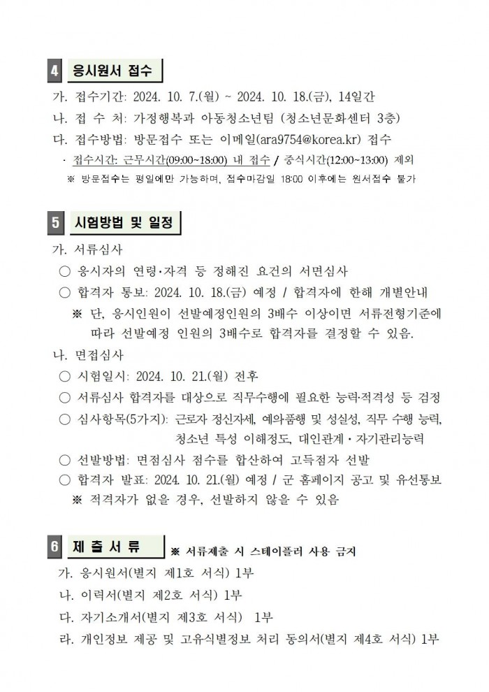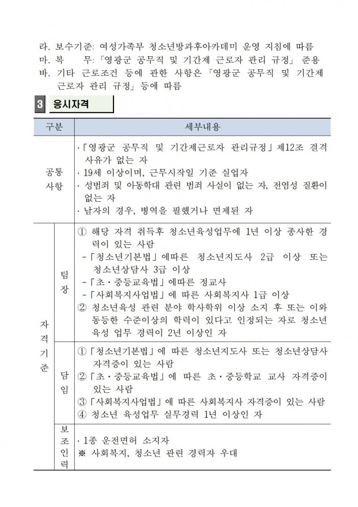 3. 모집분야: 팀장 1명, 담임 1명, 보조인력 1명
