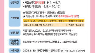영광군이 추진 중인 ‘민생회복 소비쿠폰’ 1차 신청이 오는 9월 12일 마감됨에 따라, 군은 아직 신청하지 않은 군민들에게 기한 내 신청을 서둘러 줄 것을 당부하고 나섰다. 민생회복 소비쿠폰은 정부가 국민 생활 안정과 내수 진작을 목적으로 전 국민을 대상으로 지급하는 지원 사업으로, 영광군에서는 총 ...