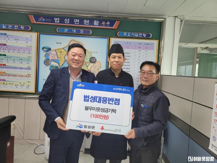 법성면(박삼성 면장)은 지난 13일 법성포에 위치한 대흥반점(대표 김광호)에서 불우이웃돕기 성금 100만원을 법성면사무소에 기탁했다고 전했다.